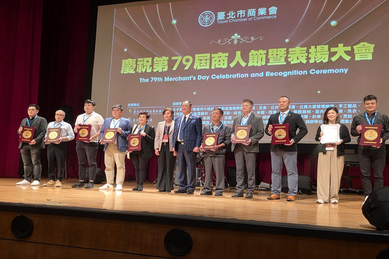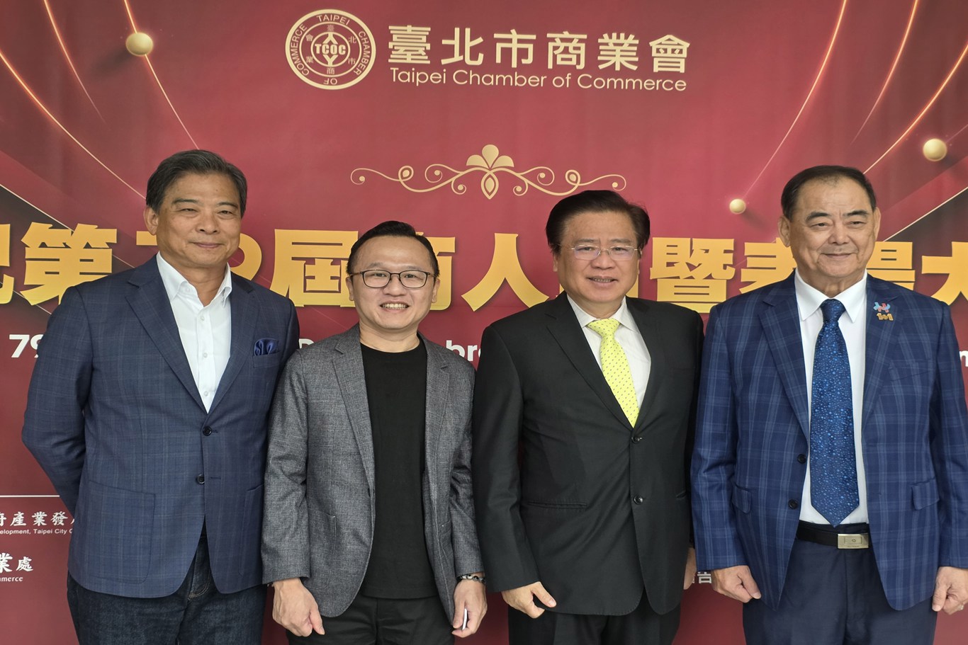本會趙一任理事長赴中油大樓國光廳出席「第79屆商人節暨表揚大會」頒獎典禮,與中華民國全國商業總會許舒博理事長(右2)、臺北市商業會吳發添理事長(右1)及柏幼林秘書長(左1)合影。