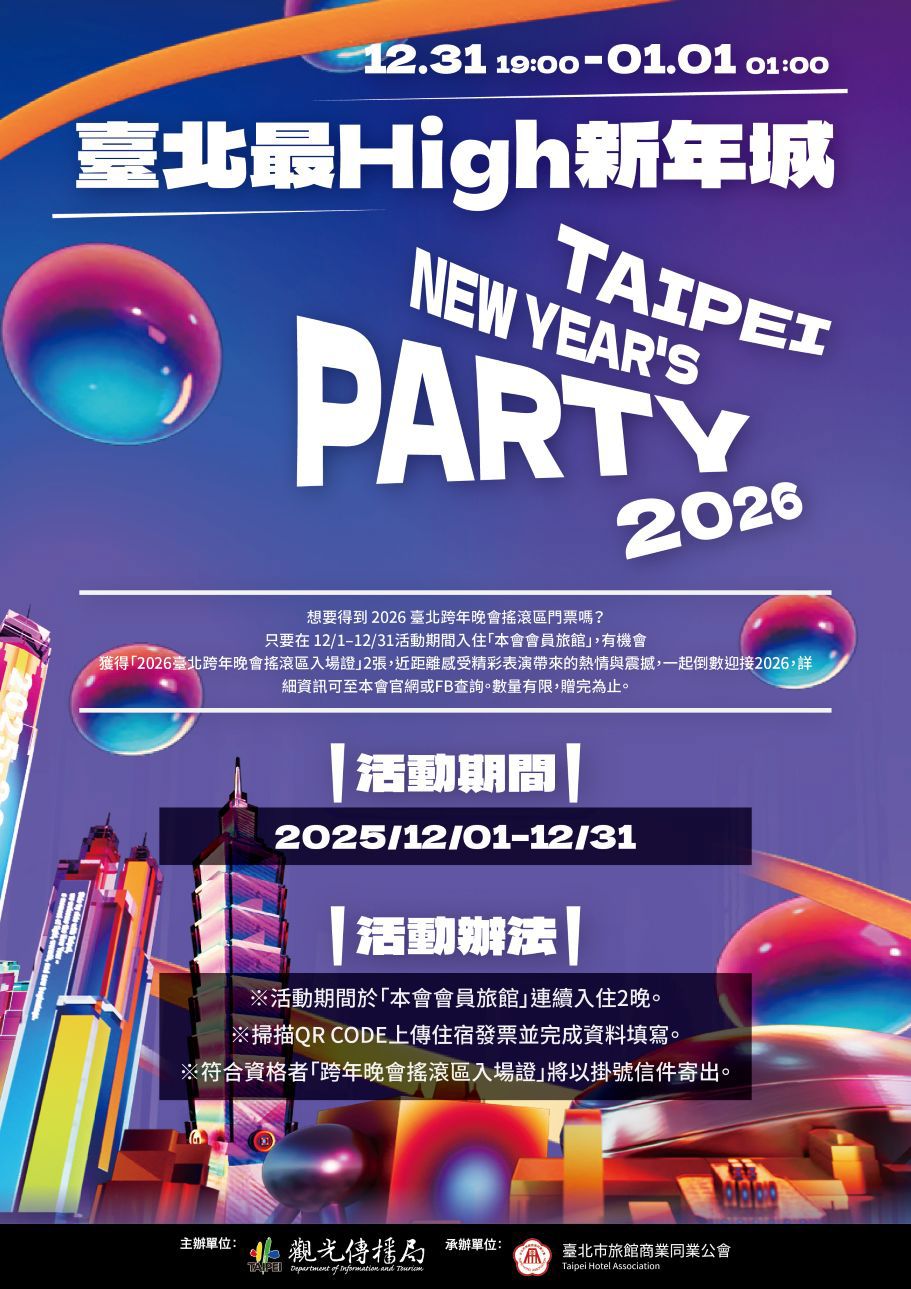 臺北市政府觀光傳播局主辦的「臺北最High新年城-2026跨年晚會」,將於114年12月31日在臺北市民廣場熱鬧登場。