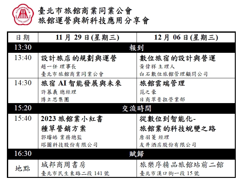 隨著日漸成熟的電腦科技及網路的普及,新科技的使用也隨著國際旅客的多樣性,所有的需求也變得更加的多變與急切,為了讓目前站在第一線的旅館業者做好面對新科技挑戰的準備,本會與旅館科技業者配合,為所有的旅館業者帶來最新的資訊以及分享,同時讓同業之間進行交流來尋找更多的解決方法與迎接新的契機。